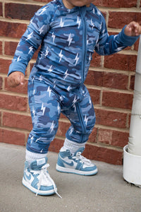 The Bamboo Zip Romper | Blue Camo Bolts brings bold energy and soft comfort together. Featuring a mix of layered blue camo shades and striking white lightning bolts, this bamboo baby romper adds a modern, playful twist to everyday wear. Made from buttery soft bamboo fabric, it’s breathable, stretchy, and perfect for little ones who love to move.