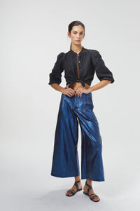 Discover the bestselling high-waisted Culotte Metallic Linen Pants, designed with a structured waistband for added support and comfort. These metallic wide pants are perfect for those who love a snug fit around the waist and have a defined waistline. They offer a flattering silhouette and are ideal for creating a chic, polished look. They are made with our signature premium 100% organic linen, finished with a metallic coating. They have side pockets and front zipper fastening with a hook.