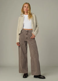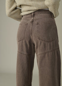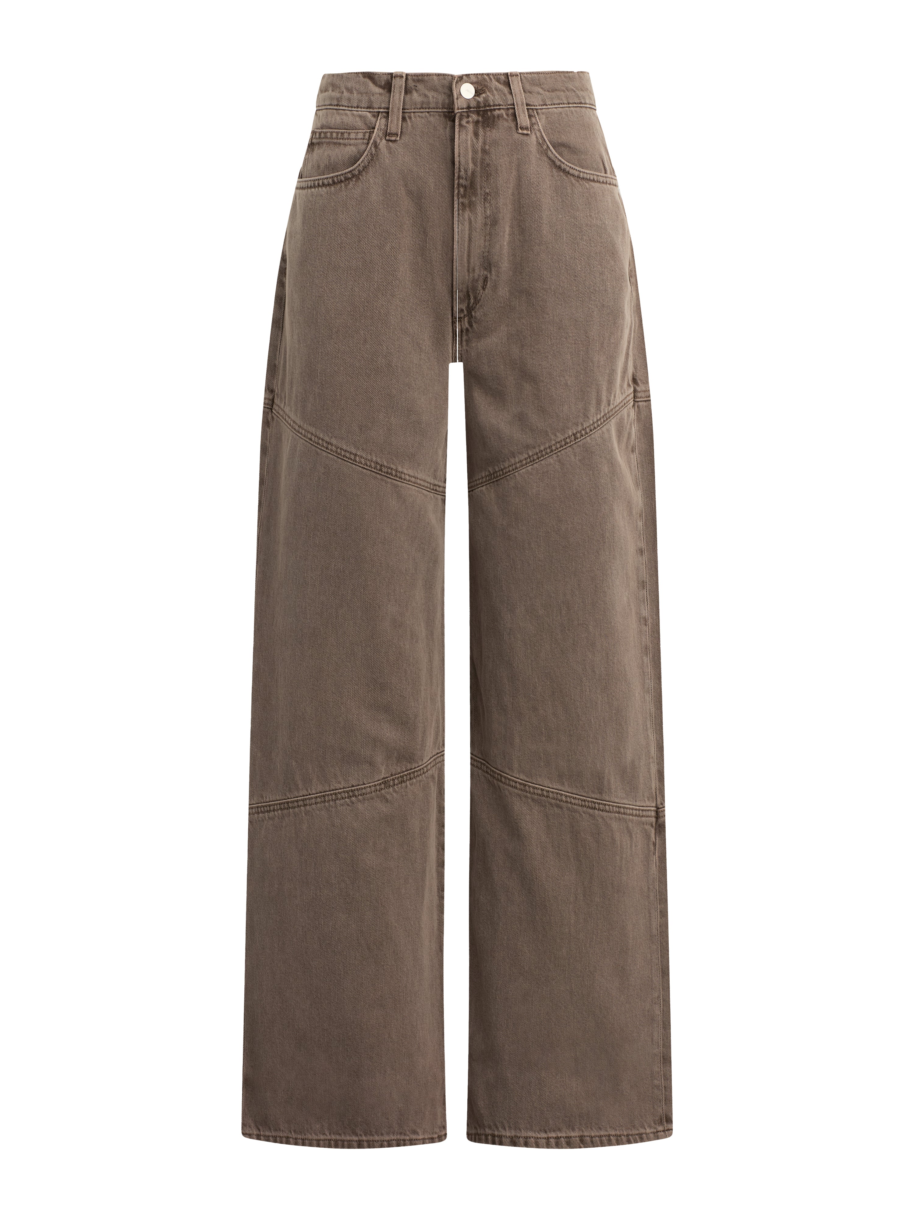 A high rise that sits at the natural waist with a relaxed seat, roomy hip and thigh, and full-length wide leg.