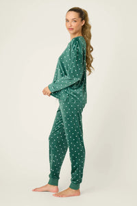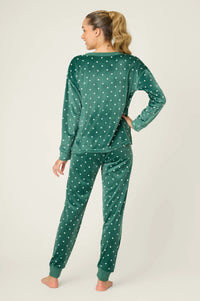Silky-soft forest-green velour makes this set as plush as it is festive. The long sleeve henley top features a button placket and banded cuffs, paired with jogger-style pants finished with a drawstring waist and cuffed hems. Scattere