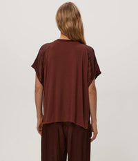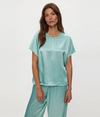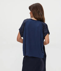Designed from our luxe washable satin, this easy fitting tee has a crewneck, short sleeves and a contrast cotton back. Pair this tee back to the Cyrus Pant or the Pixie Jogger for the perfect quiet luxury look.