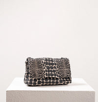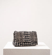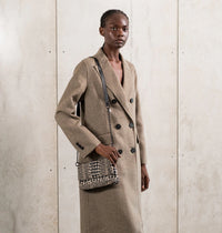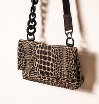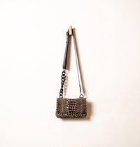 Tokyo Clutch is made of a unique recycled material that is lightweight and washable. It can be worn as a crossbody with A new adjustable crossbody strap, featuring a removable sculptural plastic chain element, adds an extra touch of detail, elevating the bag's versatility and style. or be held as a clutch.