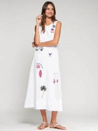 Sleeveless midi dress in straight cut in white. Surf embroidery distributed on the front, round neck and straight hem.