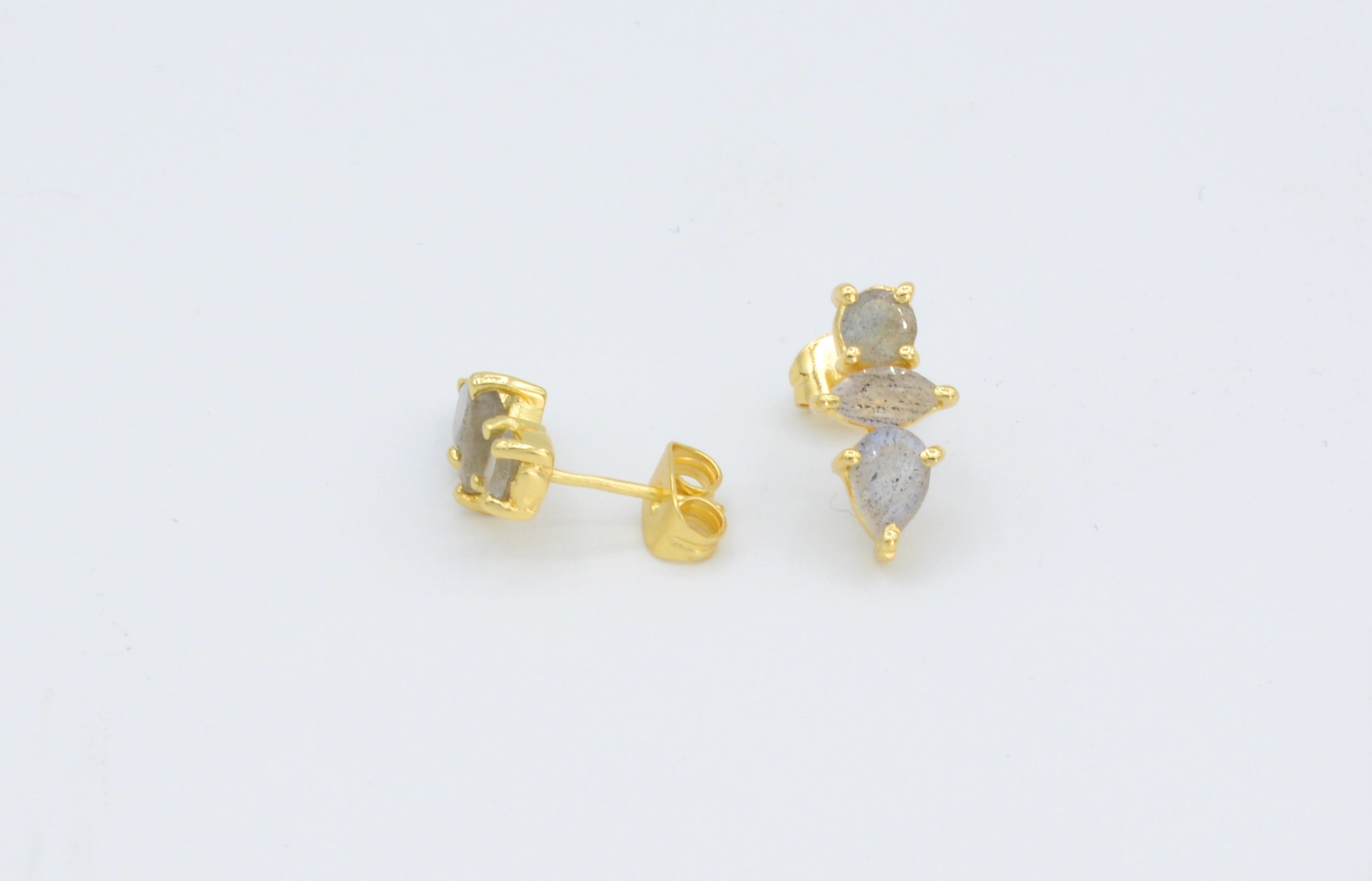 Delicate and lightweight, these triple labradorite studs feature three glowing stones set in 14kt gold-plated brass. Just 1/16" long, they're the perfect hint of shimmer for everyday wear.