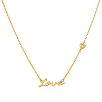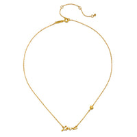 An 18kt gold plated necklace shines with "Love" in a delicate script; a tiny heart on the chain adds a sweet detail.