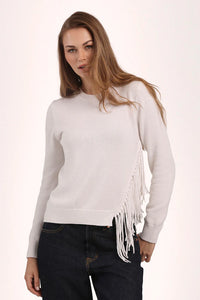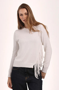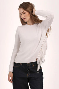 Cotton Cashmere Fringe Trim Crew Neck Pullover