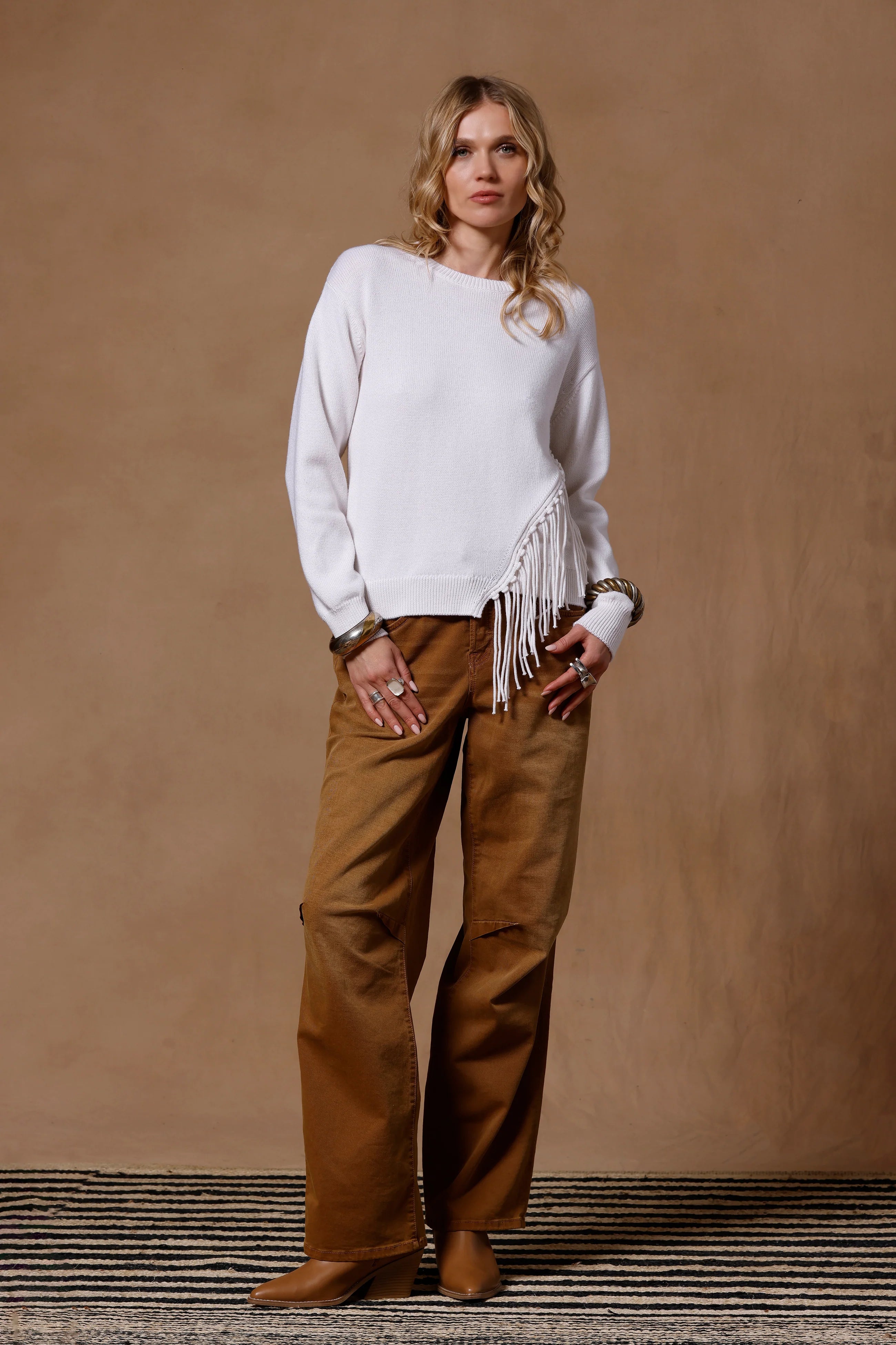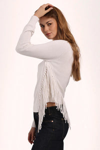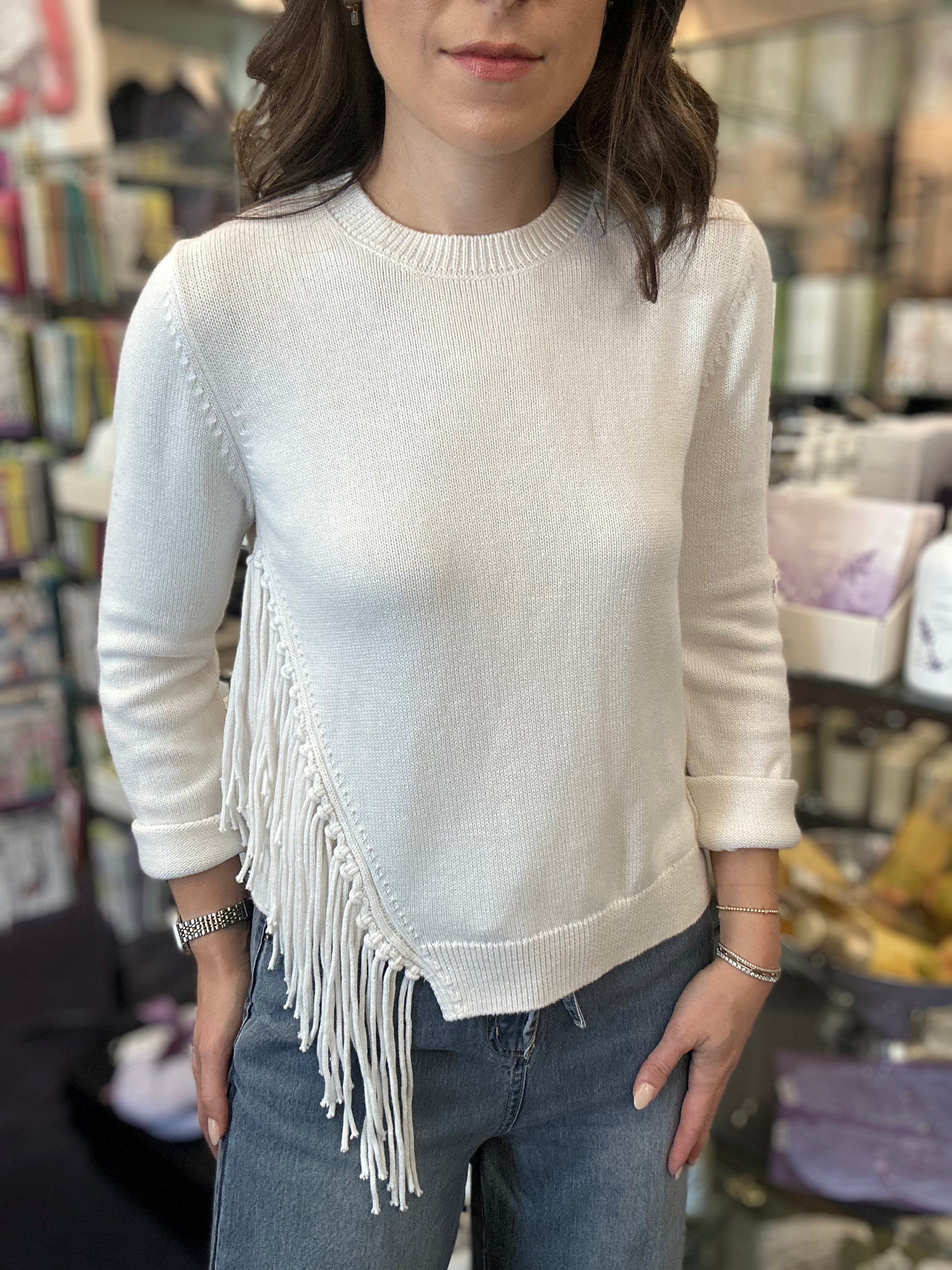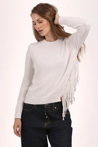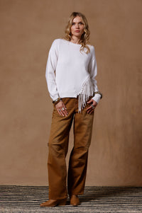 Classic crew, meet flirty fringe. This beautiful crew neck is your not-so-basic basic—soft, lightweight, and finished with just the right amount of swish. The effortless silhouette is made from our signature cotton cashmere yarn (read: cozy with a side of luxe), while the tonal fringe adds movement, texture, and a little main-character magic.