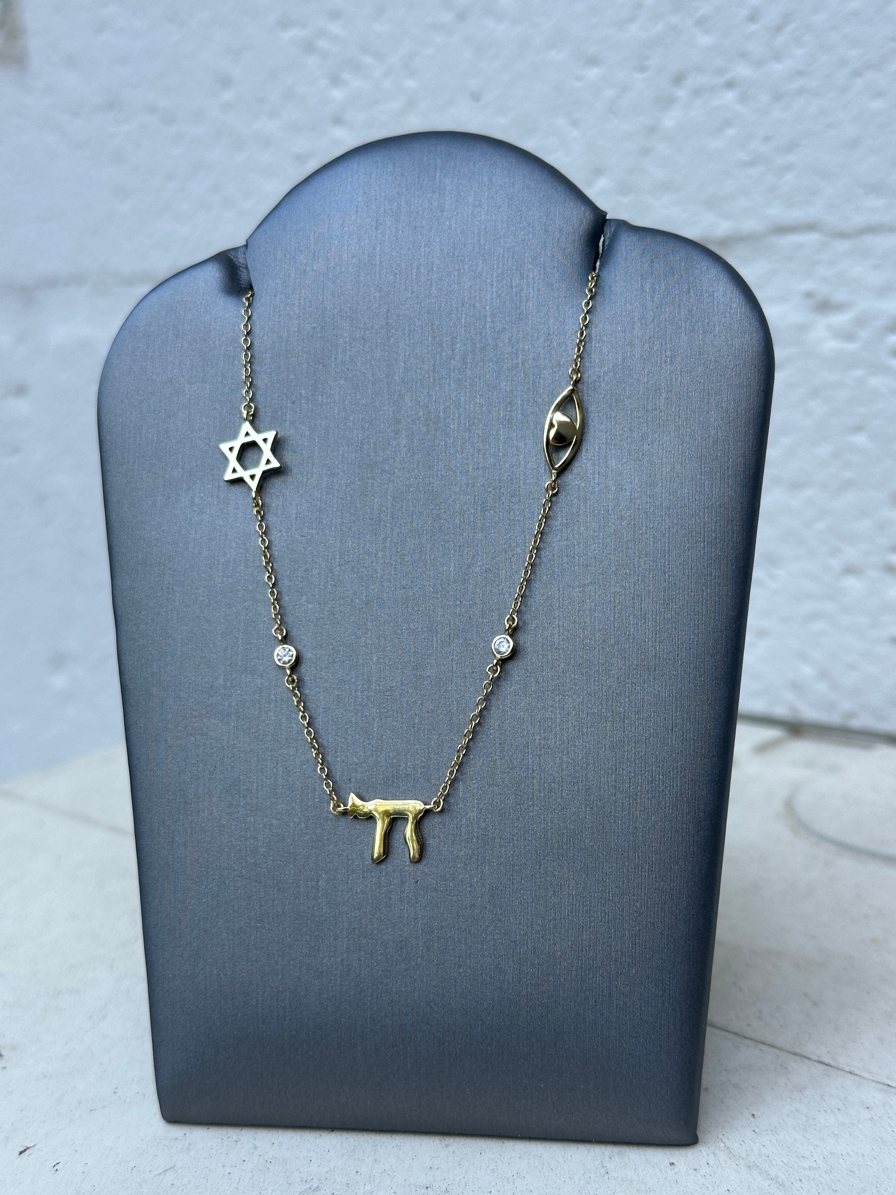 Featuring the Star of David, the Evil Eye with a heart at its center, and the Hebrew “Chai” (meaning “life”), this piece carries a message of spirituality, love, and positivity.