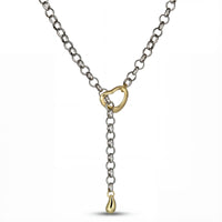 A modern lariat necklace featuring a silver rolo chain that loops through a sleek heart connector, finished with a tassel ending in a gold teardrop.