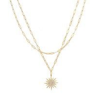 Cheerful cz accented sunburst charm on delicate, layered 14k gold filled paperclip chain.