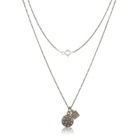 Round diamonds flush set in oxidized sterling silver round tag disc alongside an oxidized rectangular tag with additional flush set round diamonds, both on an oxidized sterling silver chain.