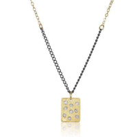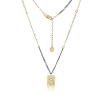 Your choice of a gold-plated rectangular diamond pendant on oxidized sterling silver, gold-filled and rose gold-filled chain or a rectangular sterling silver diamond pendant with Oxidized sterling silver, rose goldfilled and sterling silver chain.