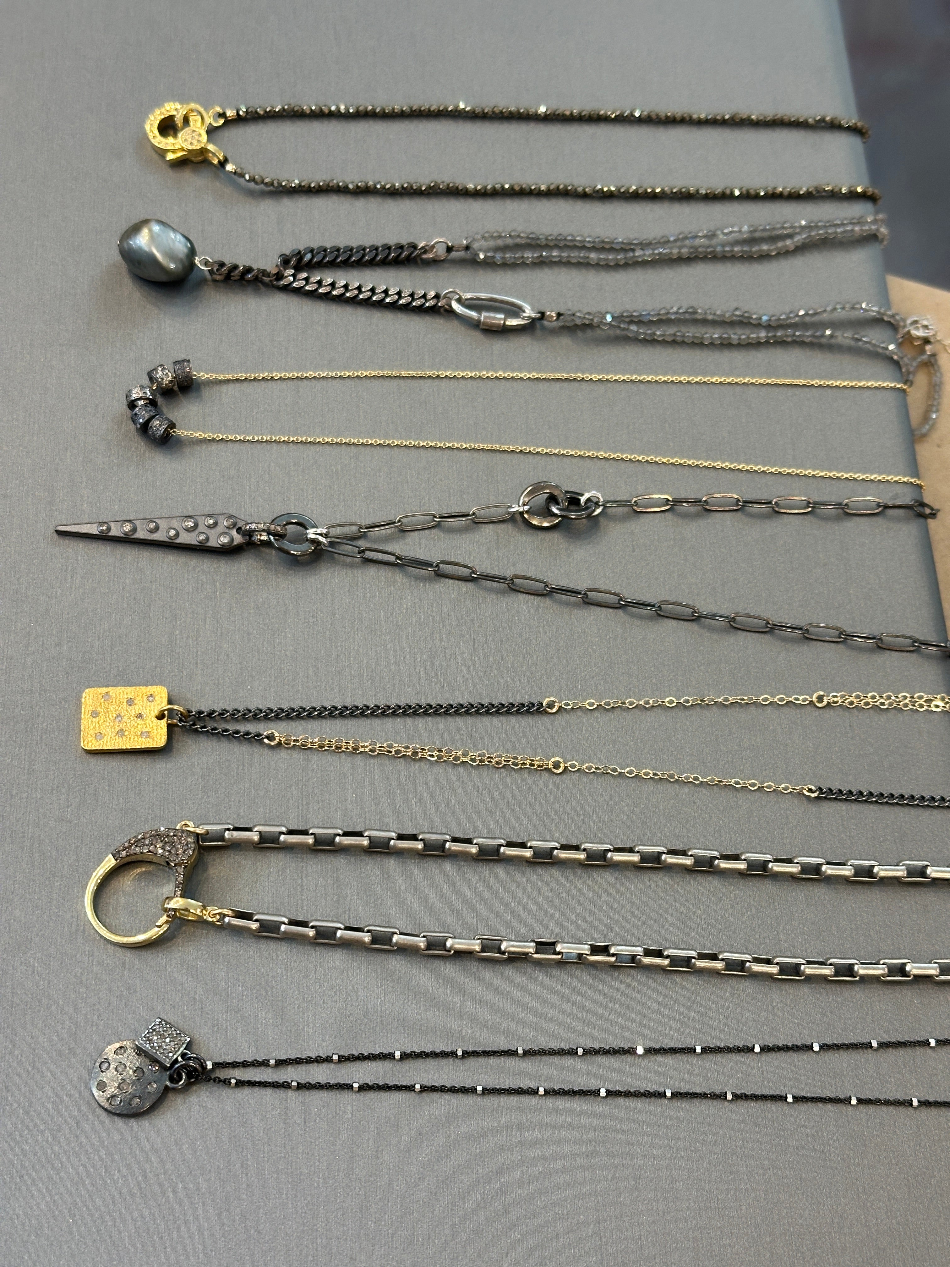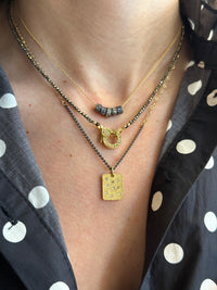 14k chain and oxidized silver or gold filled.