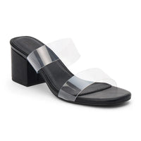 The Aura vegan sandal by Beach by Matisse features a black upper with clear straps and a block heel, delivering a sleek, modern slide silhouette.