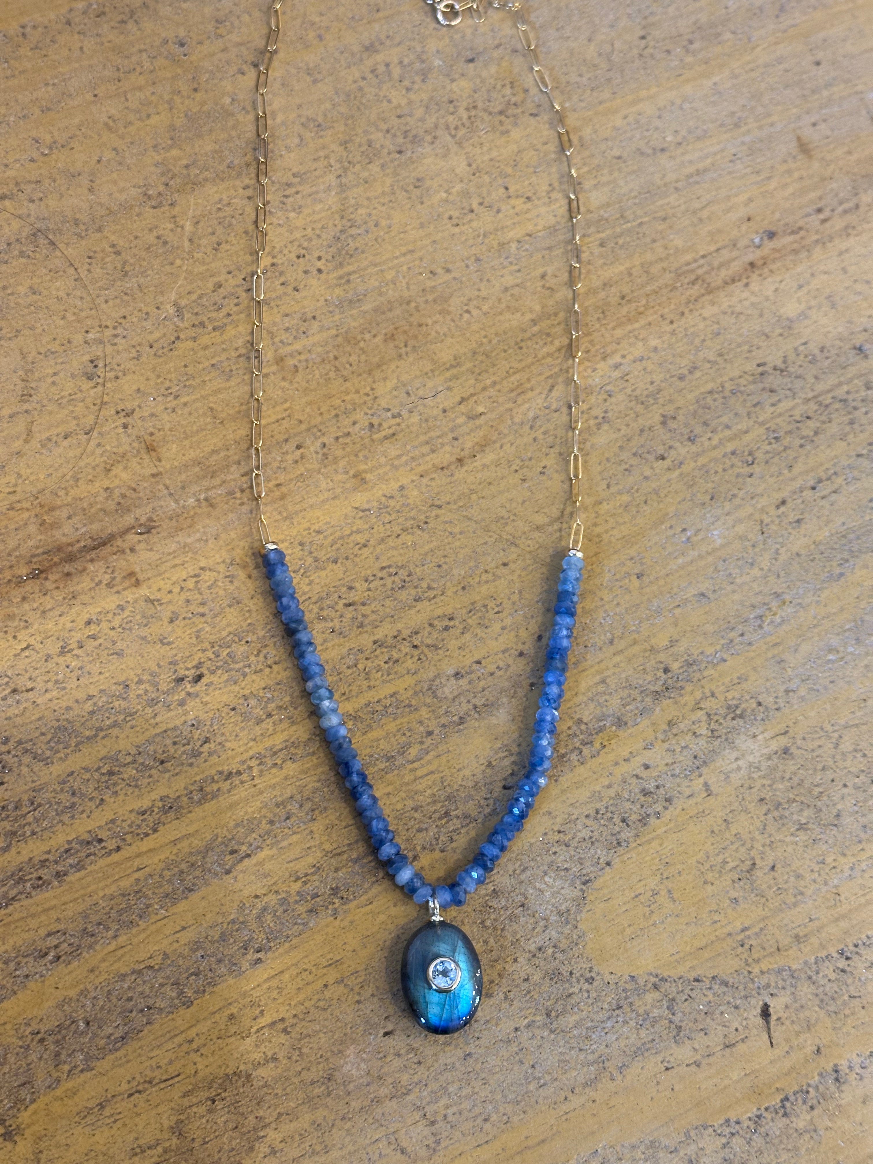 Kyanite beads with a center labradorite and sky blue topaz charm, 14k gold filled paperclip chain, adjusts 16-18."