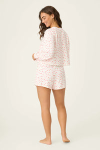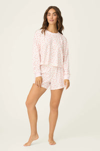 Sweet, soft, and made for lounging with love. This two-piece boxer set features a relaxed long-sleeve top and matching shorts in baby peachy waffle fabric. The ivory base is sprinkled with tiny pink hearts—the perfect playful touch for cozy mornings, self-care nights, and everything in between.