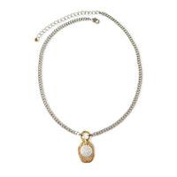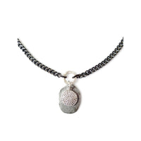 Curb chain and disc with gunmetal micro pave CZ coin in crystal Cubic Zirconia.