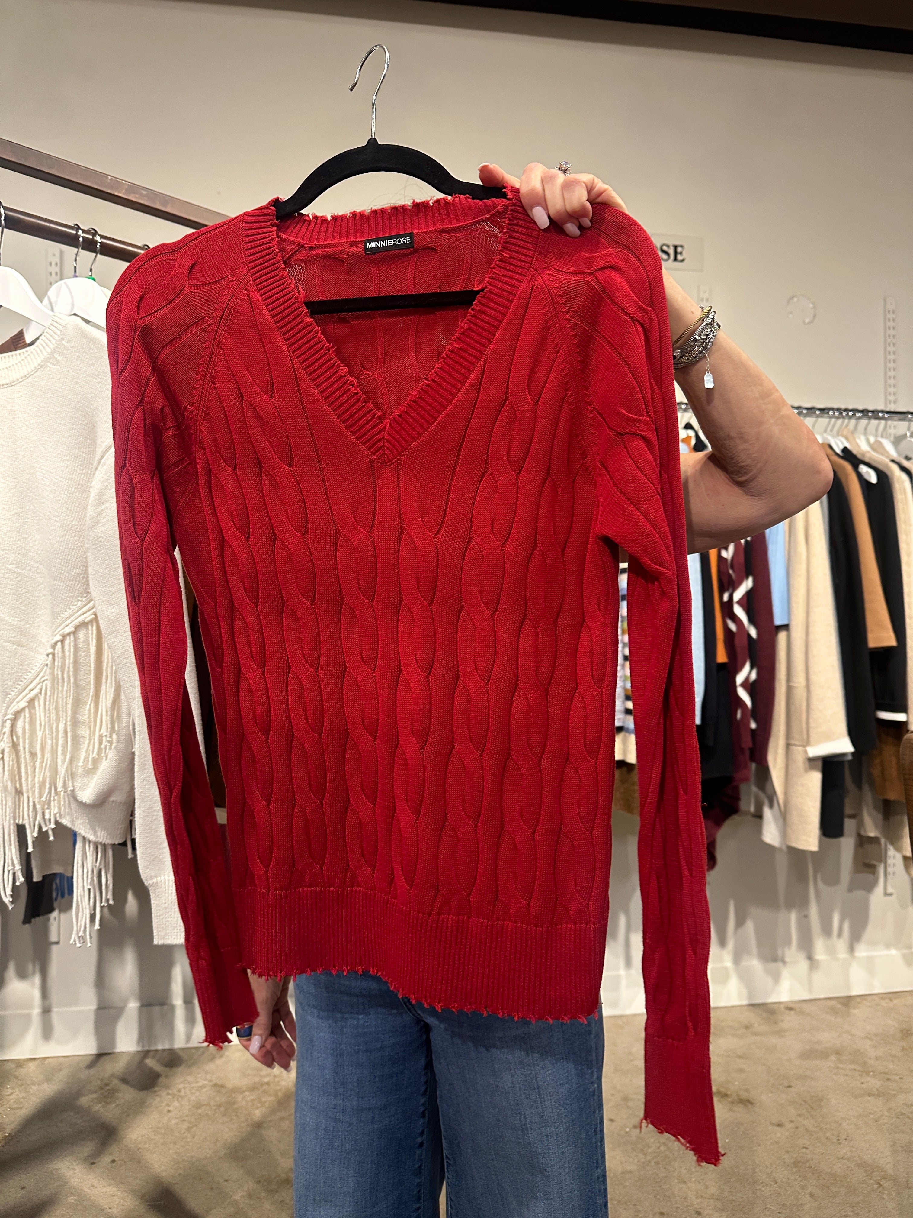 Frayed Edge Cable Knit V Neck