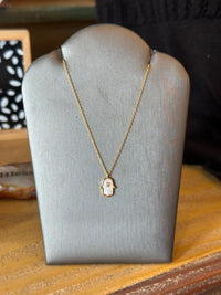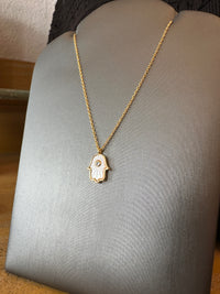 short necklace with mother of pearl with a single hand set CZ accent, Gold finish, Hamsa